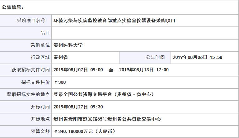 8月6日,贵州医科大学委托贵州卫虹招标有限公司,对其环境去人与疾病监控教育部重点实验室仪器设备采购项目进行公开招标,项目编号为GZWH-2019-2315,采购预算340.18万元,最高限价为340万元。