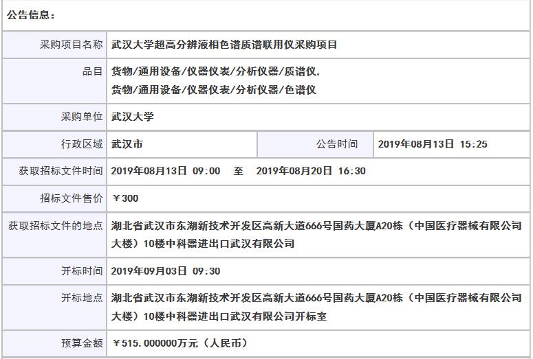 为了推动学者、学科、学术、学风、学生的协调发展,不断提高学校综合实力和核心竞争力,近日,中科器进出口武汉有限公司受武汉大学的委托,根据《中华人民共和国政府采购法》等有关规定,现对武汉大学超高分辨液相色谱质谱联用仪采购项目进行公开招标,项目编号为WHCSIMC2019-1110434ZF(H),采购预算515万元人民币。开标时间为2019年9月3日9时30分。