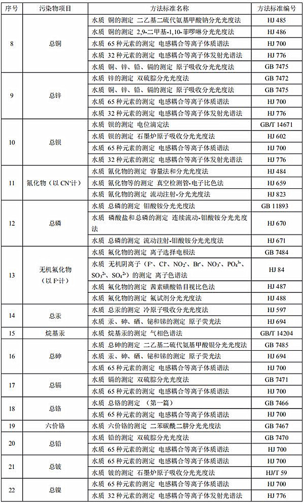 PH、生化需氧量、化学需氧量、总有机碳、悬浮物、氨氮、总氨、总铜、总锌、总钡、总磷、总汞、总铬、总砷、烷基汞、总银、总镍、总铍、总铅、六价铬、氰化物、氟化物、苯并芘、浑浊度、氯化物等。