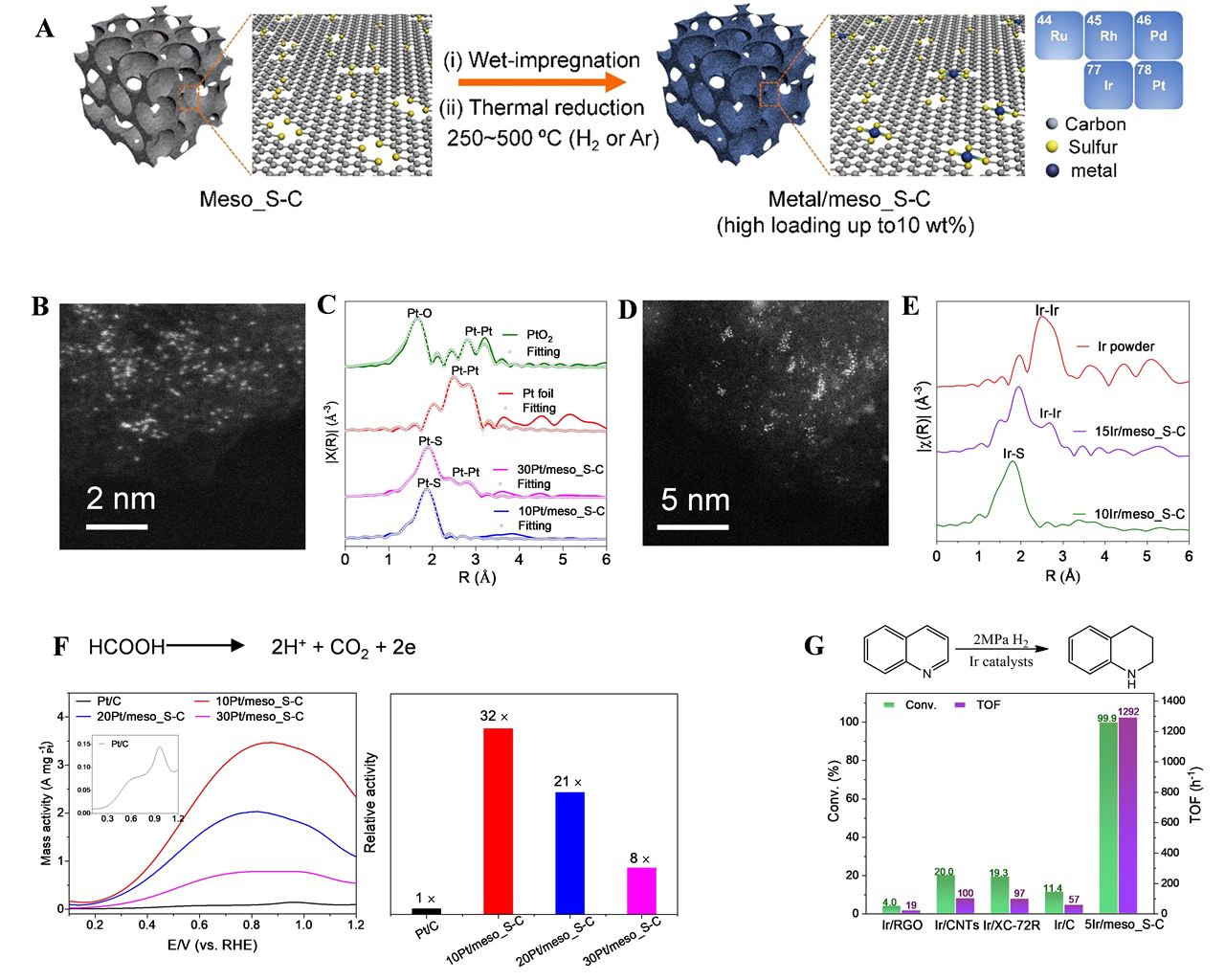 当金属颗粒降低到一定尺度(纳米尺寸甚至原子级分散)时,由于其较高的原子利用效率和独特的电子特性,负载型金属催化剂往往会展现出极高的催化活性和特定的选择性。然而,随着金属颗粒尺寸的降低,金属的表面自由能会急剧增大,很容易导致金属团聚。传统的解决方案通常以牺牲金属载量来制备原子级分散催化剂,这极大地限制了该类催化剂的实际应用。近日,中国科学技术大学教授梁海伟课题组与博士林岳以及中国科学院高能物理研究所副研究员储胜启合作,使用高比表面积硫掺杂介孔碳(meso_S-C)为载体,基于贵金属与硫之间的强键合作用原理(根据软硬酸碱理论,贵金属和硫分别属于软酸和软碱,因此二者之间可形成强共价键),制备出一系列高载量原子级分散贵金属催化剂,包括Pt、Ir、Rh、Ru以及Pd,其中金属Pt的载量可以达到10 wt%。