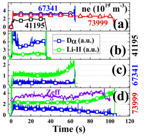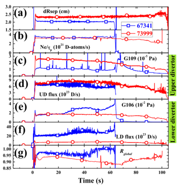 该工作在EAST多轮物理实验数据的积累上,对比分析了装置的常规壁处理手段、锂化硅化涂层处理、内置低温泵和锂弹丸注入等技术方法对再循环的影响。研究结果表明,内置式低温泵粒子排出速率可达1020-1021 D-atoms/s和再循环系数Rglobal从1.0降低到0.8,能有效地降低偏滤器靶板区域的中性气压和燃料的再循环效果。涂层处理对控制氢氘比的效果明显优于第一壁烘烤和放电清洗等常规手段,特别是锂化涂层可以将氢氘比降至3%,该工作还对锂弹丸注入技术对再循环的控制问题进行了分析。多种壁处理方法的配合使用能够降低氢氘比、再循环系数,为101秒的H模等离子体获得提供了良好的显著壁条件。相关成果这将对未来EAST和其他聚变装置在更高功率的400-1000秒长脉冲稳态H模等离子体运行提供参考经验。