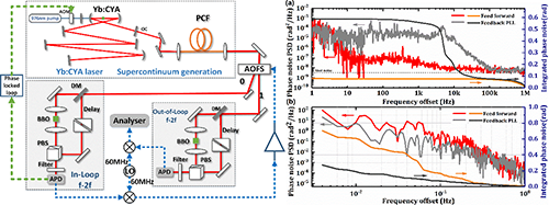 中国科学院物理研究所/北京凝聚态物理国家研究中心光物理实验室L07组多年来一直致力于低相噪高稳定光学频率梳技术及频率锁定的研究,曾提出整形光谱自差频测量fceo的技术,证明了一种获得高信噪比fceo的方案,并结合电子锁相环反馈控制技术实现了相位漂移低至55mrad的超低相噪钛宝石光频梳。近年来,一种新的fceo反馈技术——前置反馈锁定技术,由于可直接补偿抵消fceo漂移,因此受到人们的广泛关注。所谓前置反馈锁定技术,是在输出激光中插入一个声光调制移频器(Acousto-optic Frequency Shifter, AOFS),通过将测到的fceo频率直接调制到声光晶体上,从而在其一级衍射光中得到频率被量身修正的输出激光。相比传统的电子锁相环反馈技术,前置反馈锁定没有比例积分滤波(PID)环节,相当于具有很宽的带宽,因此可以瞬时响应误差信号,从而很好地抑制高频相噪,理论上具有极低的噪声。最重要的一点,AOFS是直接插入在输出激光中,对激光器系统没有任何影响,这就大大增加了该技术的实用性。最近,该组的副研究员韩海年、博士研究生张子越和研究员魏志义等人在多年努力的基础上,首次实现了全固态克尔透镜锁模Yb:CYA激光fceo的前置反馈锁定,从而实现了一种超低相噪的全固态新型光学频率梳。图1所示为实验装置及结果,实验中他们研制的全固态克尔透镜锁模Yb:CYA激光的输出功率为200mW、脉宽为57fs、重复频率为84MHz,通过在AOFS的零级和一级衍射光后各搭建一套f-2f干涉装置作为内环和外环,并将内环测到的fceo信号直接反馈到AOFS以控制fceo的漂移、外环测到的fceo信号用于分析锁定结果。得益于AOFS前置反馈锁定控制带宽的大幅度提升,最后测得该光频梳的fceo积分相位噪声(1Hz-1MHz)低达79.3mrad,相对采用传统锁相环泵浦反馈方式的316mrad结果,相位噪声降低了70%,这也是迄今基于全固态激光在1um波段得到的最低fceo相噪。此外通过对1Hz以下相位噪声功率谱密度和长时间频率不稳定度的分析,表明他们发展的该项技术在高频相噪抑制方面更具优势。该项工作结果以Ultra-low-noise carrier-envelope phase stabilization of a Kerr-lens mode-locked Yb:CYA laser frequency comb with a feed-forward method 为题目发表在最新一期的《光学快报》上(Optics Letters Vol.44(22),2019)。