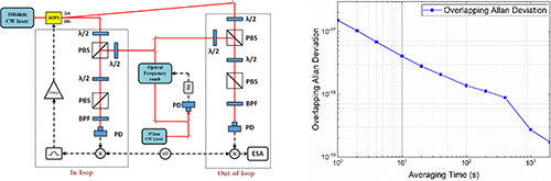 如何实现光频梳和连续激光之间的相干连接,是光频梳和光频测量比对研究中另一个具有重要意义和挑战性的研究内容。将锁定到超稳激光的光频梳再与任何一个连续激光相干连接,超稳激光的频率稳定度可准确地传递到这个连续激光,这样就成为一个完美的光学频率综合器,可在微波至光频波段提供任意的低相噪高稳定频率源。AOFS前置反馈锁定技术同样可以用于连续激光和光频梳之间的相干连接,基于该项专利发明(专利号:ZL 201811074118.3),韩海年、博士研究生邵晓东和研究员魏志义等人也进一步实现了频率稳定性的相干传递。实验中首先将一台1064 nm连续激光器和光频梳进行拍频,然后将得到的拍频信号与本振信号混频后驱动AOFS以实现前置反馈,这样经过AOFS后的一级衍射光就被锁定到了光频梳上(图2左),这台光频梳是锁定在一台超稳972nm连续光源上。锁定前,1064nm连续激光器每小时的频率漂移约几十kHz,锁定后测量得到10000 s积分时间下一级衍射光的频率漂移偏差仅为4.1 mHz,对应的频率稳定性为1.5×10-17/s(图2右),噪声被极大压制,长期稳定性也得到了极大提高,很好地实现了光频梳和连续激光之间的相干连接。主要结果最近以Precision locking CW laser to ultrastable optical frequency comb by feed-forward method 为题目发表在AIP Advances 9(11)2019上。