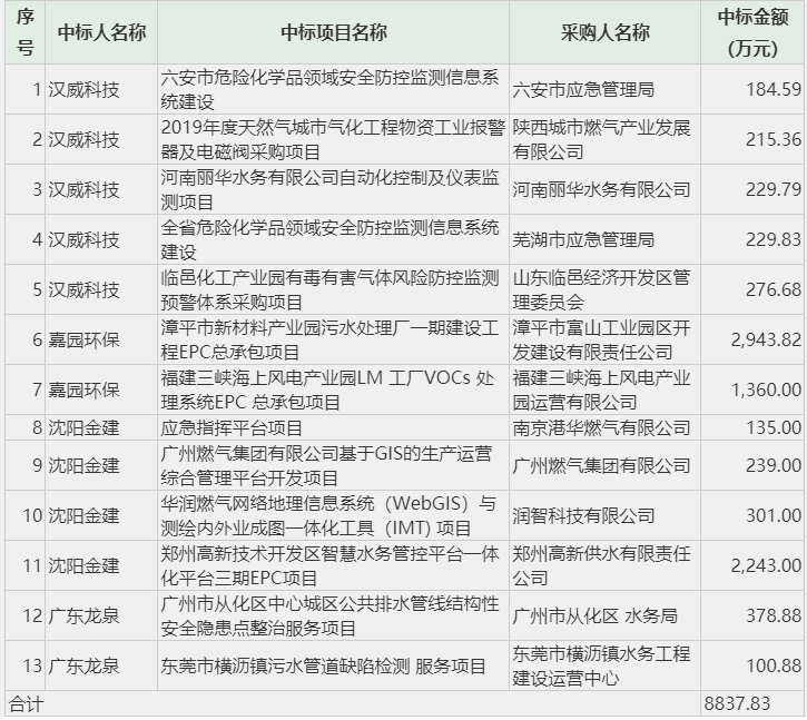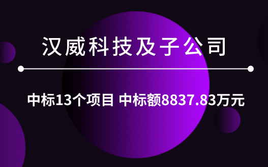 11月25日,汉威科技发布公告称,公司及下属子公司嘉园环保有限公司(“嘉园环保”)、沈阳金建数字城市软件有限公司(“沈阳金建”)和广东龙泉科技有限公司(“广东龙泉”)等近期中标了13个项目,合计中标金额8837.83万元。