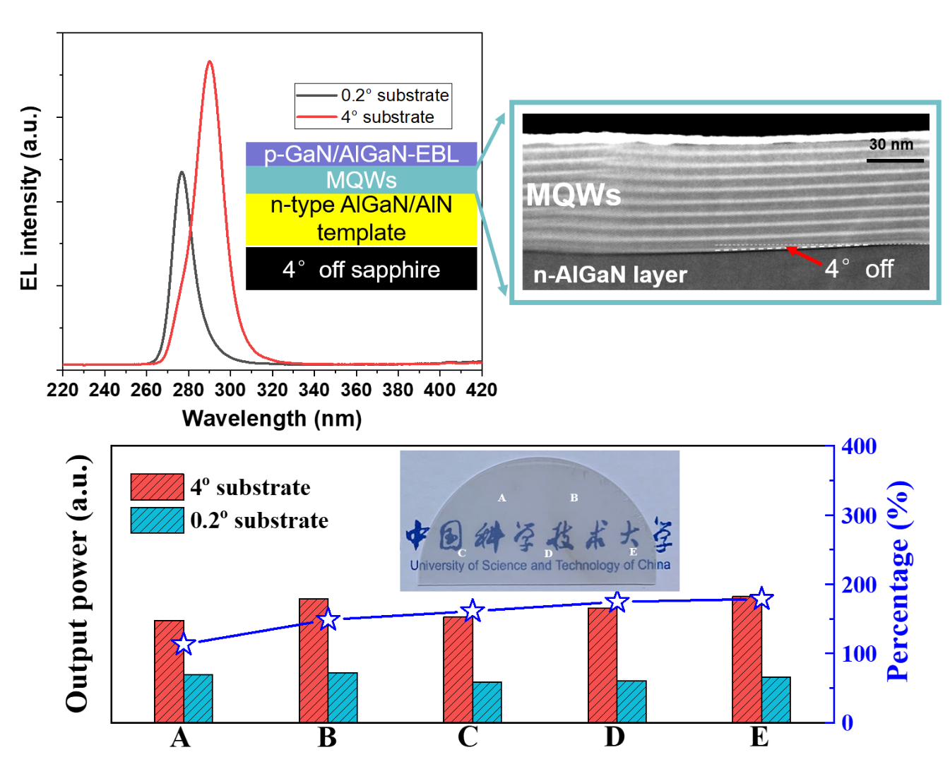 图:在0.2和4度斜切角蓝宝石衬底上制备的深紫外LED光致发光光谱和器件示意图,有源区透射电子显微镜展示了高分辨多量子阱结构图,和输出功率的对比图。