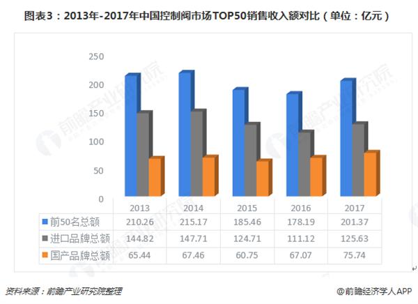 根据《控制阀信息》对全行业前50名企业的销售数据统计,2017年中国控制阀市场较2016年有较大增幅,上榜的50家企业销售总额为201.37亿元人民币,较2016年增长了13.01%。国产控制阀品牌销售额占比37.61%,比2016年市场份额37.64%略有下降,上榜企业数量33家,国外控制阀品牌销售额占比63.39%,国外品牌上榜企业为17家。