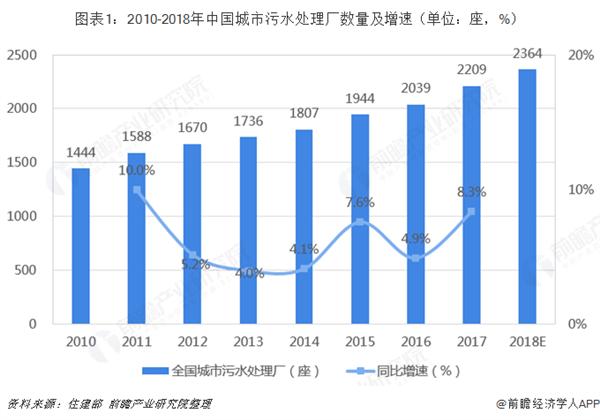 图表1:2010-2018年中国城市污水处理厂数量及增速(单位:座,%)