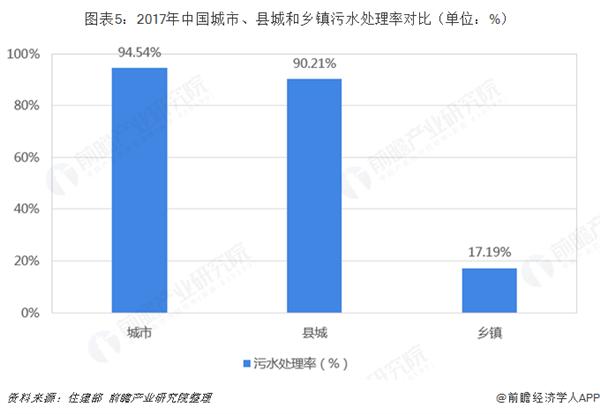 图表5:2017年中国城市、县城和乡镇污水处理率对比(单位:%)