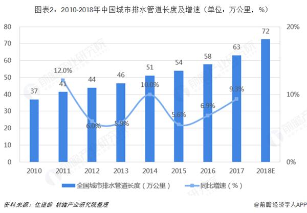 图表2:2010-2018年中国城市排水管道长度及增速(单位:万公里,%)