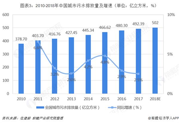 此外,尽管污水处理基础设施建设正在日益完善,但是从广义的水污染治理需求来看,这些还远远不够。以城市污水排放量为例,2010年至今,中国城市污水排放量逐年增加,2017年达到了492.39亿立方米,同比增长了2.5%,预计2018年污水排放量已经超过了500亿立方米。