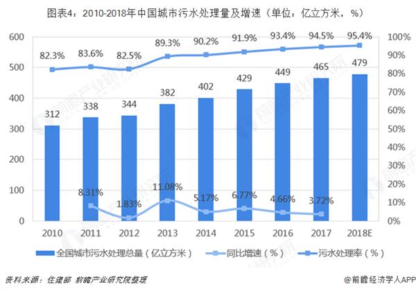 图表4:2010-2018年中国城市污水处理量及增速(单位:亿立方米,%)